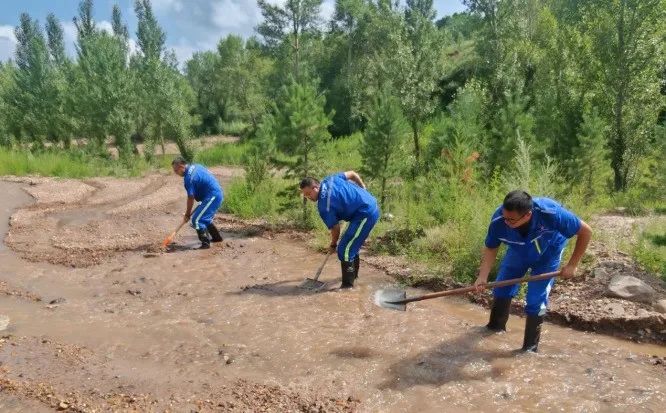 風(fēng)電公司洗馬林10萬(wàn)千瓦風(fēng)電場(chǎng)運維人員對存在積水積沙積石的溝道進(jìn)行清理