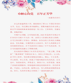 3月8日,風(fēng)電西中區域公司黨總支部、工會(huì )聯(lián)合舉辦“巾幗心向黨?百年正芳華”主題黨日活動(dòng),在第111個(gè)國際三八婦女節向公司全體巾幗致以節日的問(wèn)候和美好的祝愿。 結合疫情防控實(shí)際,西中區域公司黨總支部書(shū)記張華耀向全體女職工送上節日祝福,并表示,2020年是西中區域公司任務(wù)艱巨且極不平凡的一年?;厥坠窘M建成立以來(lái)走過(guò)的路程,公司全體女職工踐行黨員的使命與擔當,在各自的工作崗位上兢兢業(yè)業(yè)、無(wú)私奉獻,以強烈的主人翁意識,將個(gè)人利益和公司的發(fā)展緊密結合,在平凡的崗位上做出了不平凡的業(yè)績(jì),為公司的建設發(fā)展做出了積極貢獻。在慶祝新中國成立70周年系列活動(dòng)、“搶工期、保電價(jià)”“提質(zhì)增效”等重點(diǎn)任務(wù)上,西中區域公司全體女職工工作既出色、又出彩;在日常工作中,女職工們用女性特有的耐心、細心,守土有責、守土擔責、守土盡責,彰顯了節能風(fēng)電女職工的風(fēng)采;在生活中,大家揚家風(fēng),孝敬老人、教育子女、經(jīng)營(yíng)家庭,展現崇高的家國情懷;為西中區域公司構筑了一道道絢麗風(fēng)景! 公司領(lǐng)導班子向全體女職工發(fā)放節日慰問(wèn)品,工會(huì )女工委員開(kāi)展了職業(yè)女性保健護膚以及日常儀容儀表的培訓講座,共同帶去節日問(wèn)候和關(guān)懷。公司領(lǐng)導班子期望大家在妥善安排好家庭和工作的同時(shí),盡可能多地擠出時(shí)間學(xué)習,不斷充實(shí)自己,不斷提高修養,時(shí)刻適應時(shí)代發(fā)展和建設學(xué)習型社會(huì )的需要,樹(shù)立終身學(xué)習的理念,努力提高自身素質(zhì),以素質(zhì)樹(shù)地位,以素質(zhì)求平等,以素質(zhì)做貢獻,著(zhù)力打造學(xué)習型、知識型、創(chuàng )新型的新女性,切實(shí)增強自身的能力。并強調:“‘巾幗不讓須眉’,在公司領(lǐng)先發(fā)展的路上,廣大女職工大有可為,大有作為?!?/p> 2021年是西中區域公司的發(fā)展之年、生機之年,更是努力奮斗的一年。公司領(lǐng)導班子真摯的問(wèn)候和祝福使公司全體女職工倍感溫暖和鼓舞,大家紛紛表示要更加努力工作,與西中區域公司同舟共濟,揚帆奮進(jìn),讓自己的人生出彩、夢(mèng)想成真,為公司再添光彩,譜寫(xiě)節能風(fēng)電人光榮與夢(mèng)想的新篇章。